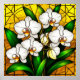 An artistic display of white orchids depicted within a vibrant stained glass art style, emphasizing golden hues in the background with lush greenery. Perfect for floral and decorative themes.
