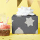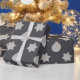 Christmas gift wrap adorned with silver glitter stars and baubles (simulated in art work no glitter used)