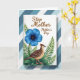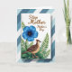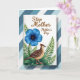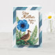 This greeting card features a central white panel set over diagonal stripes in cool blue and white, giving the layout a calm, modern backdrop. Near the top of the white panel, the words “Step Mother” appear in a warm brown, with “Mother’s Day” placed just below in a smaller matching style. A large five-petal flower in intense blue sits prominently, its petals showing fine line textures that make it look softly luminous ❤️. Down at the lower right, a small bird rests among leafy greens, angled to the left as if quietly watching the flower. Its feathers are patterned in dark brown and beige with a lighter speckled belly, and a reddish-brown crest adds a gentle touch of character. Fern-like fronds and broader deep-green leaves curl around the bird and bloom, creating a cozy, caring scene 🌼. The blue petals radiate from a tiny golden center, while the bird’s pinkish-orange legs stand out against the layered foliage.