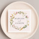 Add a touch of rustic elegance to your special day with these watercolor wildflower wedding napkins, designed to impress your guests and elevate your table setting. Featuring your names in stylish dark gray lettering framed by a wreath of greenery and delicate blooms in golden yellow, soft pink, and purple, these personalized napkins are set against a blush pink background for a romantic, nature-inspired look. Perfect for spring and summer weddings, bridal showers, or garden receptions, these custom napkins combine charm and functionality, making them a beautiful keepsake for your celebration.