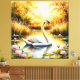 A serene water scene featuring a white swan on a lily pad pond, surrounded by autumn foliage. This relaxing nature composition showcases vibrant seasonal colors and reflects peace and harmony.