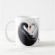 Elegant swans forning a heart together. One swan is majestically white and exudes grace, while the other is in deep black and has a mysterious aura around it. They symbolize the love and connection between two souls.