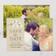 Warm and refined, this split-panel save the date features a soft tan background panel with a delicate watercolor white floral sprig and deep teal-green typography alongside a full-bleed couple photo. The earthy neutral palette gives it a timeless, organic elegance. All text including names, date, and location are fully customizable.
