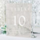 Elegant frosted taupe frosted acrylic wedding table number sign featuring "Table" and the table number in classic white serif typography, and your names and your reception date in modern white typography. Create each table number and add to your shopping cart one at a time, then check out when all numbers are in your cart.
