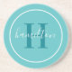 An elegant sandstone coaster featuring a teal serif initial and custom family name in script, framed by a white circle on a vibrant aqua background. The fresh, coastal-inspired palette brings bright energy to any tabletop. A cheerful personalized gift for housewarmings, beach lovers, or summer entertaining. All text is fully customizable.