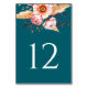 Create your own personalized wedding table number card featuring elegant floral design. Features minimalist chic typography and boho chic fall floral of watercolor dahlia flowers and autumn botanical leaves on teal color.