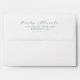 This wedding envelope features a minimalist and elegant design with a clean white background. The layout includes a soft teal cursive script for the names, paired with a modern sans-serif font for the address, creating a harmonious color palette. The centered alignment and ample negative space emphasize clarity and sophistication, making it perfect for formal invitations or announcements. Its understated charm conveys an approachable yet refined tone, ideal for couples seeking a timeless look.