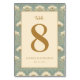 This elegant wedding table card features a sophisticated design with a central bold number "8" framed by cream and gold borders, set against a calming teal background adorned with stylized white floral patterns. The typography combines a whimsical cursive for the word "table" with clean serif fonts for names and date, creating a refined yet modern aesthetic. Perfect for formal celebrations, this card exudes an air of timeless elegance and gentle sophistication, making it ideal for marking special moments at your event.