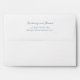 This wedding envelope features a minimalist design with centered text on a clean white background. The names are elegantly displayed in a flowing cursive script, while the address is presented in a modern sans-serif font, both in a soft teal color that adds a touch of sophistication. The layout emphasizes simplicity and balance, creating an understated yet refined look perfect for formal occasions. With ample negative space, this design conveys a serene and polished aesthetic, ideal for couples seeking elegance without excessive embellishment.