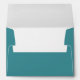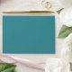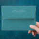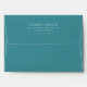 This wedding envelope features a minimalist design with a calming teal background and crisp white text, creating an elegant contrast. The layout is vertically oriented, with evenly spaced lines of centered text that enhance readability and sophistication. Utilizing clean, serif typography, the design exudes a formal and refined mood, perfect for conveying essential details in a stylish manner. Its simplicity makes it ideal for weddings or formal announcements, offering a modern yet classic aesthetic.