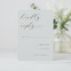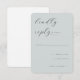 This wedding RSVP card features a minimalist design with a soft pastel teal background, creating an elegant and calming aesthetic. The layout is clean and spacious, with script-style typography for the phrase "kindly reply" paired with a serif font for clarity and sophistication. Customizable fields allow guests to indicate their attendance status and number of attendees, ensuring functionality without cluttering the refined appearance. The overall mood is graceful and subtle, making it ideal for formal occasions that require polite and organized communication.