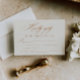 Classic wedding response card featuring a serene off white colored background and elegant terracotta calligraphy.