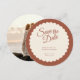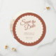Elegant yet modern and with a touch of retro glam, this Wedding Save the Date card features a scalloped shaped circle, shades of Terracotta and Cream Beige with elegant script calligraphy as well as your image of choice on the back. Customize this design with your own wedding information and engagement picture. Use the design tool to adjust the placement of the image (sample image used is horizontal).