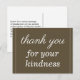 This elegant, clean thank-you postcard design features the message "thank you for your kindness" on the front, along with a customizable message on the back. It could be used to offer thanks to somebody who has done something special.