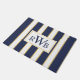 Add a touch of stylish elegance to your front entrance with this custom striped monogram mat.. The simple design features stripes of blue and white with gold accents. Personalize with a three letter monogram in a traditional blue typography