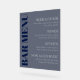 Acrylic wedding bar menu sign with gray and navy blue typography printed on a transparent dark blue background. Dark transparent bar menu sign printed on acrylic with a transparent dark blue background, bar menu written along the side in navy blue, and the menu itself in elegant gray fonts.