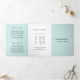 Elegant trifold brochure in turquoise / teal featuring your business name with swashes in a handwritten script calligraphy on the front panel. The back panel has your hours of operation and contact information. The inner fold panel has two headers and text boxes. The inside has multiple templates for information about your business on the outer panels and a price list in the middle panel. This simple and feminine design is great for a makeup artist, hair stylist, lashes technician, beauty / nail salon or any woman owned business.