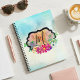 The cover features a breathtaking watercolor wash background, seamlessly fading from a vibrant turquoise aqua blue at the top to a soft, creamy off-white. At the center, a chic black bracket frame creates a bold focal point, encasing a warm, peach-splashed background with artistic paint speckles. The prominent black script monogram (shown here as "M") can be easily personalized to display your own initial, making it truly one-of-a-kind. The frame is adorned with a lush floral bouquet featuring vibrant pink cosmos, magenta blooms, white pansies, and delicate green climbing vines.