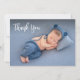 Simple Modern Elegant Calligraphy Script Photo Newborn Baby Thank You Birth Announcement Card. Features a beautiful "thank you" text in a handwritten calligraphy font photo overlay script in white. Pre-made personal message at the back side in black and white. Great for baby shower thank you and for birth announcement. Ideal for baby girl or baby boy. Easy to personalize with your baby photo and details.