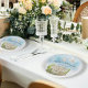 Elegant Wedding plate. Featuring a picturesque venue, fountain adorned with flowers, surrounded by charming trees, and graced by two gentle doves, this design exudes timeless elegance. The intricate details and sophisticated layout set the perfect tone for your special day. Customize with your wedding details