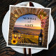 A romantic paper napkin with a wine theme, featuring a Roman arch with grapes, wine glasses, a wine bottle and sunflowers overlooking a gorgeous vineyard landscape. Beautiful for a wine themed, winery or vineyard wedding or other celebration.
