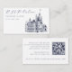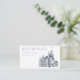 This wedding enclosure card features a vintage illustration of a castle, which you can replace with an image of your destination wedding venue. Elegant dark blue lettering lays out the date to respond by, QR code, and website URL.