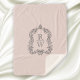 This elegant design features an ornate, vintage-inspired crest of acanthus leaves framing two monogram initials in open serif font, stacked vertically and separated by a thin horizontal line. The design and text are in charcoal gray on a blush pink background.