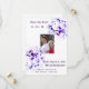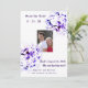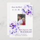 Design features couple's photo at center surrounded by violet flowers. Above photo reads, "Save the Date!" followed by the date of wedding in numbers. Below photo is the customizable text displaying the same date a written out. A brief message from Bride and Groom appears below. At very bottom city and state of wedding is displayed. All text is in Old English font. Designed to coordinate with the "Elegant Violets Catholic Wedding Suite."