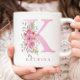 This elegant monogram mug features a soft pink letter "K" adorned with delicate watercolor floral accents, exuding charm and femininity. The floral arrangement includes roses and lush greenery in shades of pink, blush, and green, creating a beautifully balanced design. Below the monogram, the name is printed in a coordinating pink font, adding a thoughtful personalized touch.