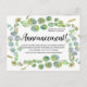 Announce the postponement or cancelation of your wedding ceremony, reception, all or part of your event with this beautiful announcement card "Announcement" change of plans postcard card. Modern contemporary green eucalyptus leaves and greenery with elegant handwriting typography lettering is classic and perfect for keeping your guests informed.