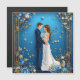 A romantic depiction of a wedding couple posing tenderly, surrounded by intricate blue and gold floral decorations, capturing an atmosphere of elegance and celebration.