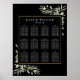 This elegant greenery eucalyptus leaves seating chart features delicate watercolour leaves with your guests' seating plan framed by a gold border on a black background with modern white typography. Designed by Thisisnotme©