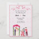 Celebrate your big day in style with this beautifully designed wedding invitation card. Featuring a romantic bride and groom standing under a floral arch decorated with pink heart-shaped balloons, while photographers capture the special moment. The soft pink patterned background and elegant typography make this invitation perfect for modern and classic weddings alike. A unique way to invite your loved ones to share in your happiness.
