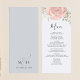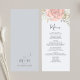 This design features an elegant modern simple wedding menu card, With calligraphy script, and blush pink floral rose and greenery with a light blue background, Perfect for reception decor