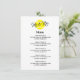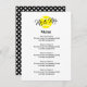 Elegant wedding menu with yello tennis ball logo. Chic template with classy typography. Fun design for athletic couples who love playing tennis. Part of matching set. Change color palette to match your scheme. Black and yellow example with polka dot print tennis balls on the back side.