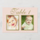 Elegant and unique custom wedding table number cards feature childhood photos of the bride and groom at an age that corresponds with the table number. To customize: type in the table number, click "change" by the default photos to upload your own digital or scanned photos, and add that individual table number card to your shopping cart. Repeat for all of the table numbers that you need. Antique gold script custom text on a blush pink (can be customized) background color.
