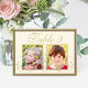 Elegant and unique custom wedding table number cards feature childhood photos of the bride and groom at an age that corresponds with the table number. To customize: type in the table number, click "change" by the default photos to upload your own digital or scanned photos, and add that individual table number card to your shopping cart. Repeat for all of the table numbers that you need. Gold colored script text and scroll frame on an light ivory background color.