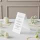 Elegant and modern wedding reception table top menu Table Tent Sign with gold script and headings.