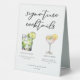This elegant wedding signature cocktails table tent sign features simple black typography above 2 drinks and their ingredients for your outdoor summer bar. A cute Gin and Tonic and Lemon Drop drawing add a cool flair to your bar menu. Complete with the couple's names and date for their reception.
