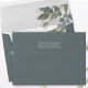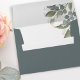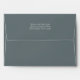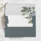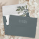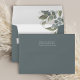 This design features a wedding floral elegant trendy dusty blue envelope template with a return address printed template, eucalyptus greenery foliage floral, babies breath white flowers,5x7 a7 envelope size, stylish elegant block lettering, custom customized personalized, a stylish trendy minimalist botanical, printed wedding invitation envelope, a custom invitation envelope