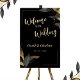 Elegant Wedding Welcome Black with Gold Sign designed with black and gold colored leaves on a black background with gold colored text. The text includes: Welcome to our Wedding, along with the Bride and Groom's First Names and Wedding Date. To personalize, simply insert your details into our easy template, replacing the sample text.