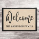 Doormat featuring the text "welcome" in an elegant script font with your family name below on a neutral, slightly textured background and a black border around the edge.