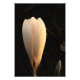 A fresh white crocus seems to glow with a warm light, standing out from the dark background. The late afternoon sunlight falls on the crocus just right to make the flower appear to shine. In this floral photo, the little crocus appears tall and elegant. The simple minimalist design makes a striking statement.