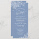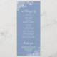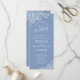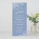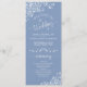 This beautiful wedding program features an elegant design with white text on a dusty blue or periwinkle colored background and lacy white curls and swirls in the corners. The titles are written in fancy script calligraphy, and there is space for your ceremony and wedding party details, as well as a short thank you for your guests. Wonderful way to welcome your friends and family to your wedding celebration.