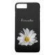 A Barely There iPhone 6 Plus Case with a photograph of an elegant white daisy with a yellow center against a pure black background. Add your name name to this pretty flowers design.