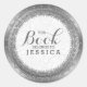 Elegant silver floral circle lace frame with white floral damask background, customizable bok sticker template.
