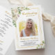 This elegant memorial program features pretty white watercolor flowers framing the photo of your loved one. The inside features two additional photos alongside the obituary, the order of service, arrangements text, acknowledgments, and funeral reception information if desired. This program can be personalized further by clicking the "customize further" link at the bottom of the personalization box if desired.