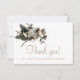 Classy elegant winter white and ivory flowers bouquet with seasonal foliage and branches and a chic gold handwritten calligraphy script making a beautiful wedding thank you simple card. ++++++++++++ Easy to personalize with your text on both sides! ++++++++++ Perfect for late autumn fall or winter floral themed weddings.