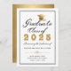 Announce your graduation in style with this elegant custom announcement card. This typography design features the words Graduate Class of 2025 with your name, school, and date to personalize in gold and white accented by a faux gold graduate cap and framed in black. The back of the card is white. Designed by Susan Coffey.