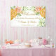 Welcome your guests with a custom banner that features a white and gold color scheme. The white background is topped with an arrangement of hand-painted gold and apricot-colored flwers and spiky greenery. It features a "Golden Anniversary" party, but can be changed to match your party or event.